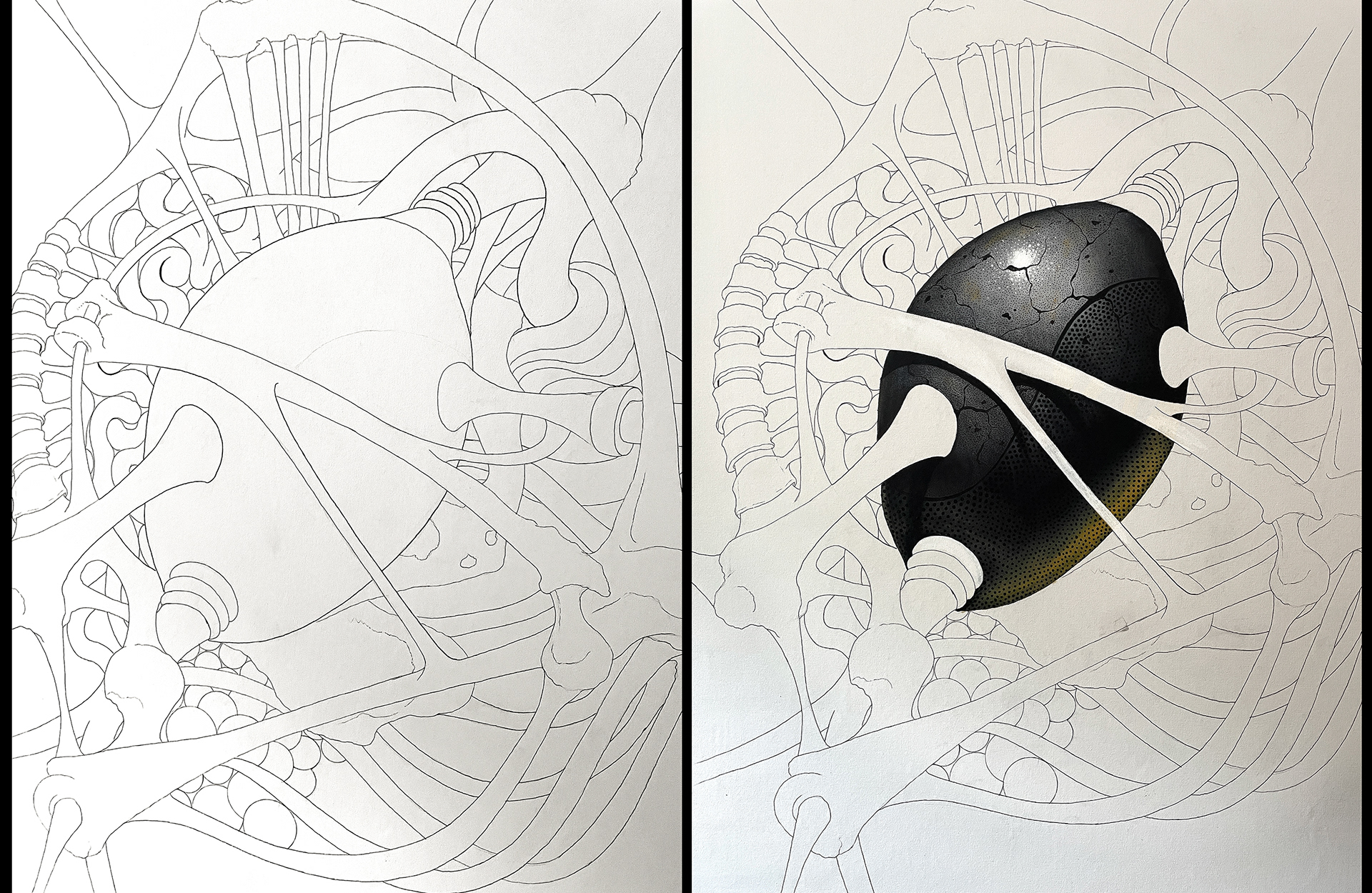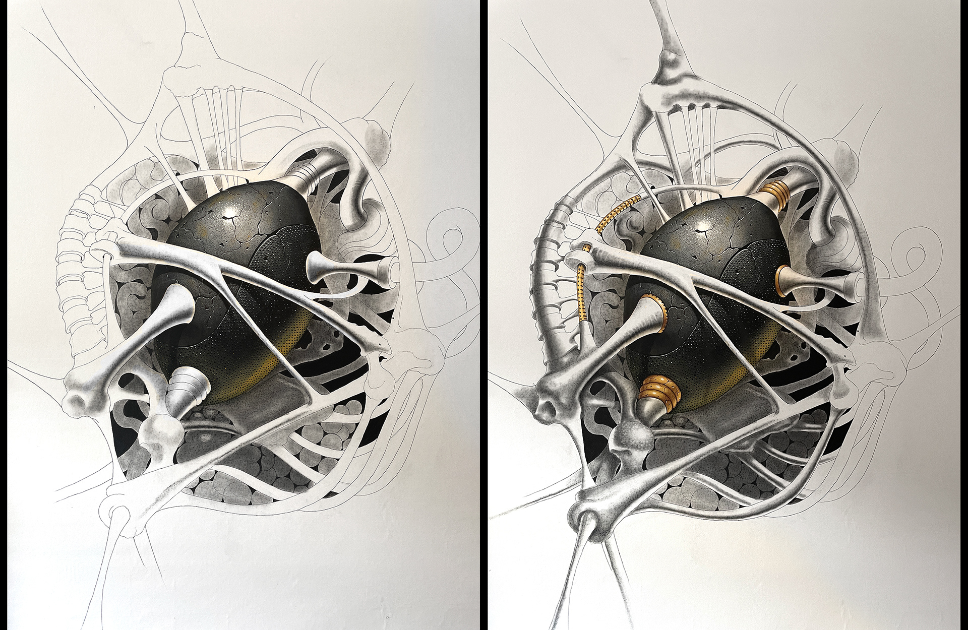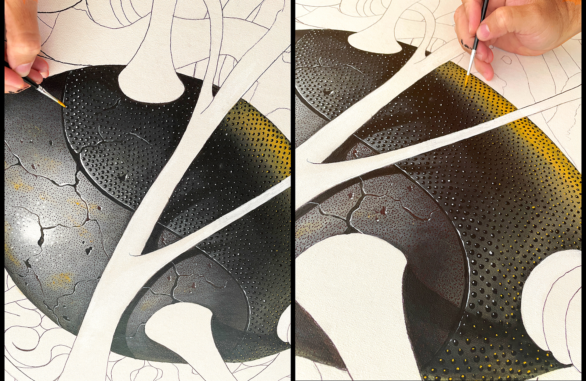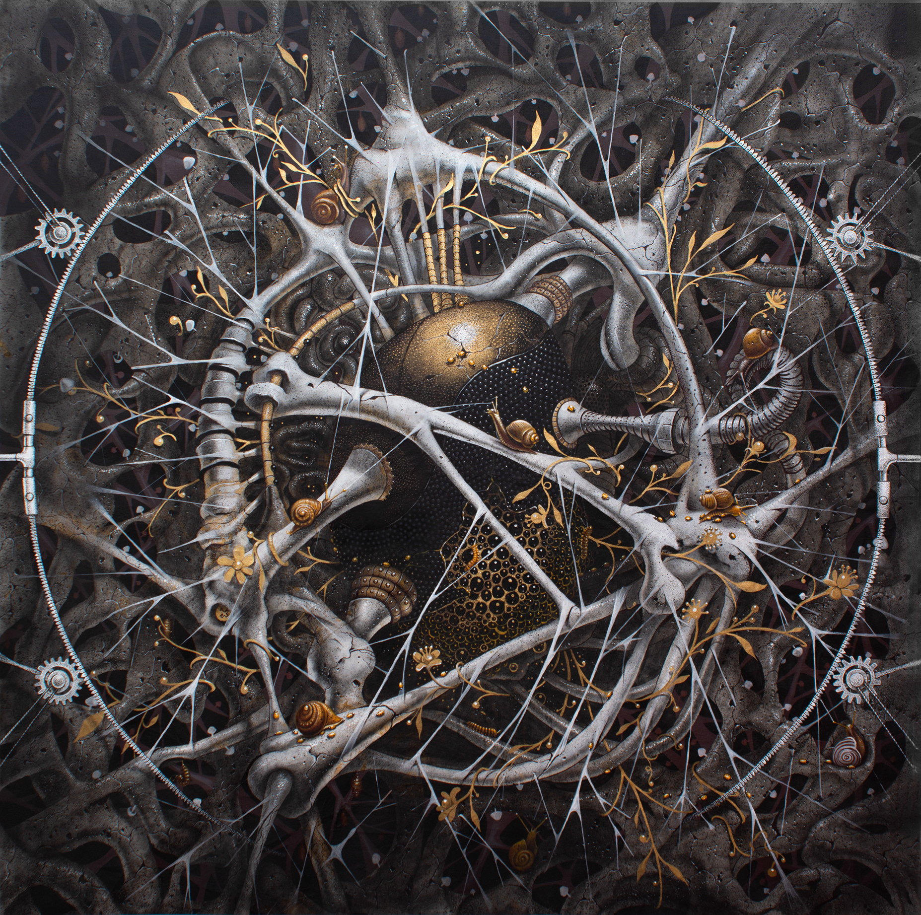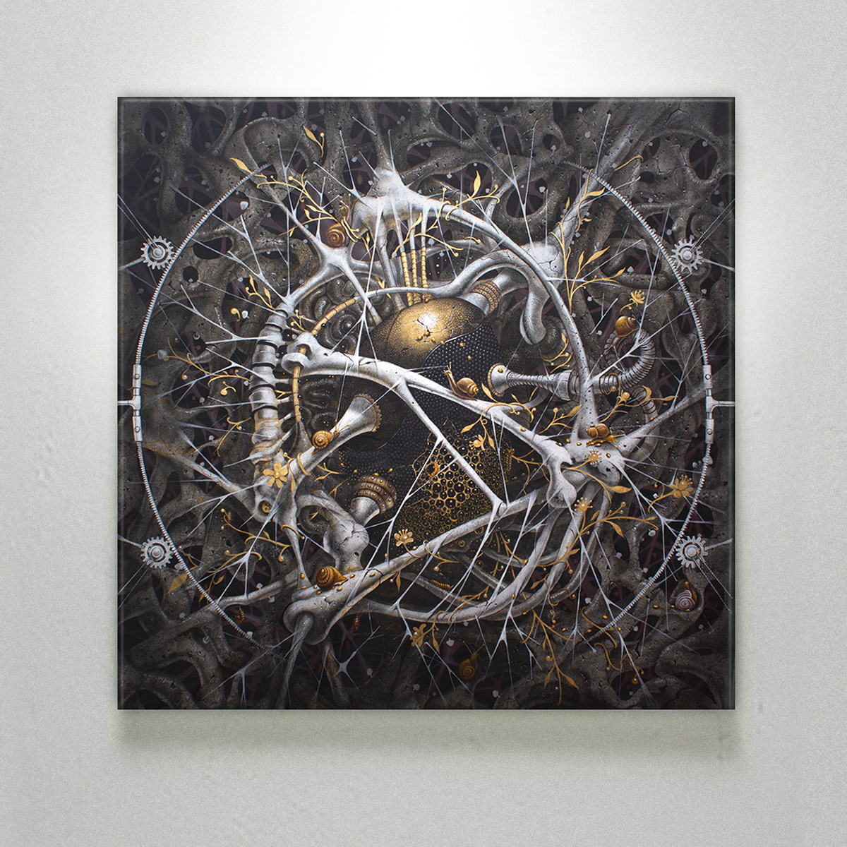 Acrylic, Charcoal and Iridescent gold ink on canvas.